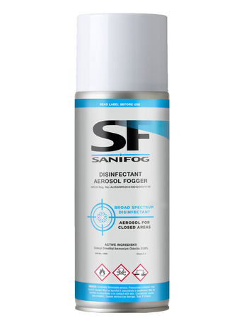 The SF-Sanifog Disinfectant Aerosol Fogger is an easy and ready-to-use highly effective disinfectant, in a pressurised can. Once triggered, the can will empty, producing a very fine aerosol mist which can be used to disinfect any closed area of approximately up to 150m3 per 500g aerosol can. The fog will reach all areas of the environment, offering total protection of the area.